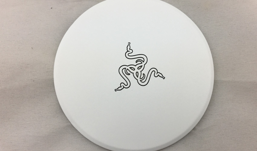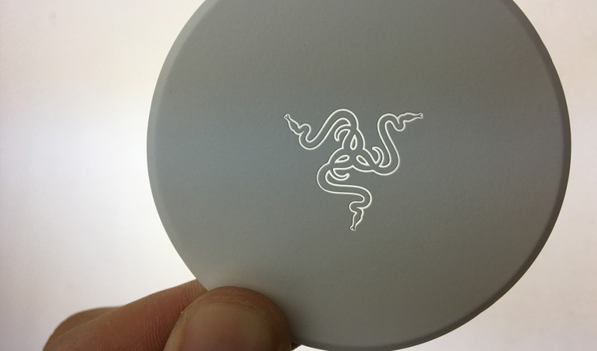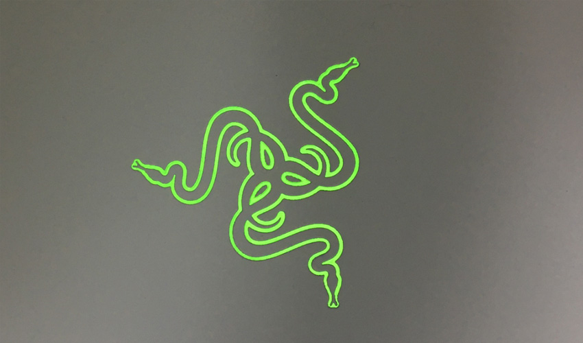 鐳雕透光雷蛇logo,尺寸直徑16.5mm,在綠色或藍色燈光下觀察,無黑邊,無鐳雕未透現象,蛇的舌頭Y形狀清晰可見,且無掉漆崩邊現象。