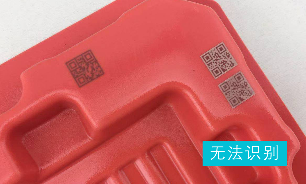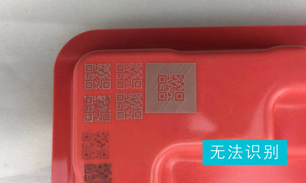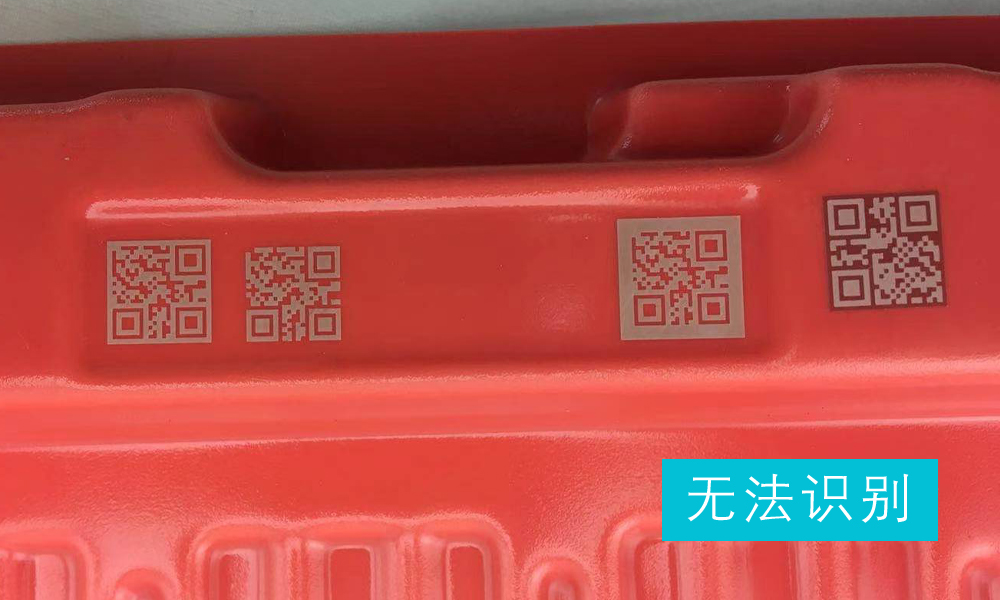 由于吸塑盒為紅色,客戶定義的掃碼槍為霍尼韋爾1900S型號(hào),掃描槍的光源也為紅色,直接雕刻出白色的二維碼也無法識(shí)別。解決辦法:先將二維碼打出深度底色,再打出白色的二維碼,即可輕松識(shí)別。